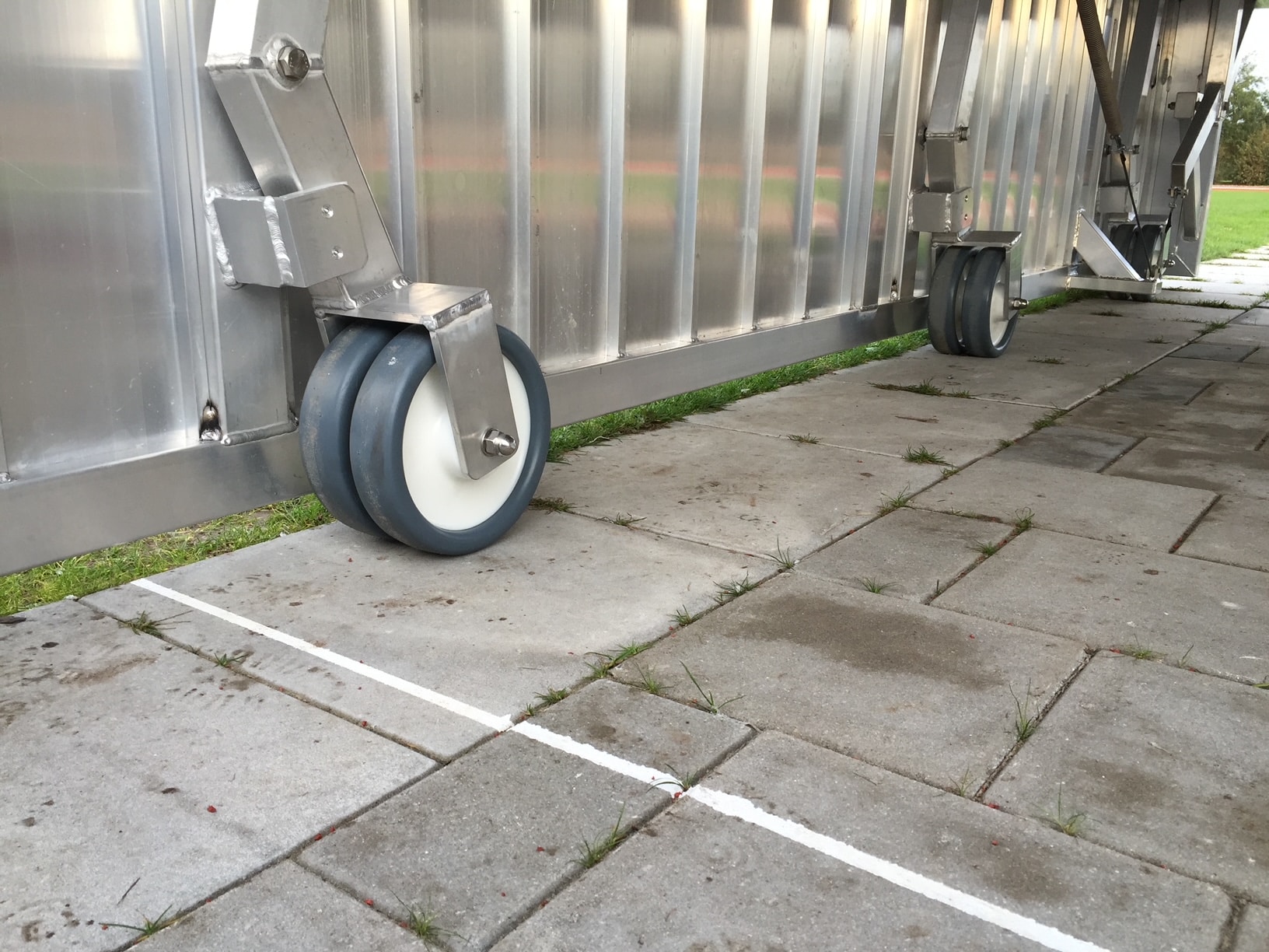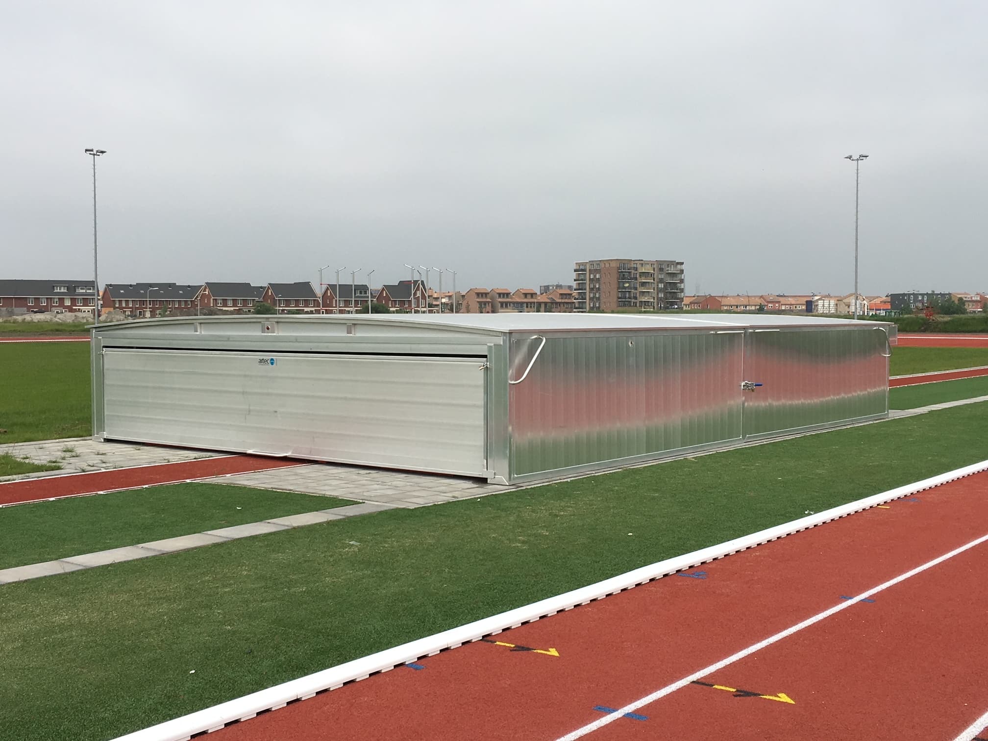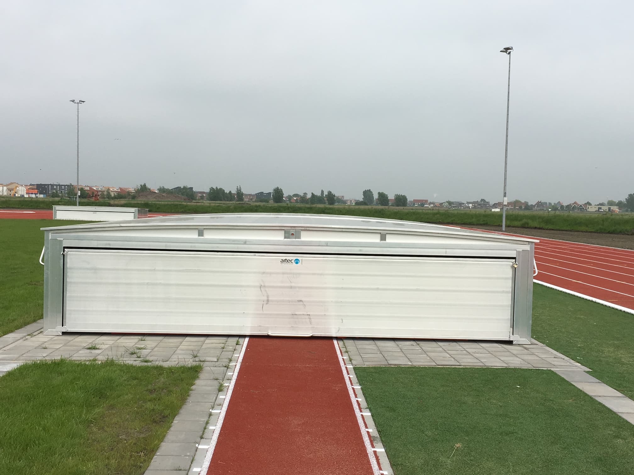 De Aluminium polsstokhoogspring overkapping is volledig gelast en is van hoogwaardige kwaliteit geproduceerd en dus duurzaam. De overkapping is dusdanig geconstrueerd dat deze bestand is tegen vandalisme. Standaard wordt de overkapping geleverd in 2 delen die makkelijk los te koppelen zijn en wordt geleverd met 1 inklapbare deur. De deur klap open en geheel naar binnen zodat er geen gevaarlijke situaties ontstaan. Bij de extra opties voor deze aluminium overkapping kan aangegeven worden welke afmetingen, extra deur (bij accommodaties die twee aanlopen hebben) of zelfs met een verlaagd systeem. Het verlaagde systeem zorgt ervoor dat de landingsmatten bescherm wordt tegen ongedierte en er kan minder vuil onder de overkapping komen.