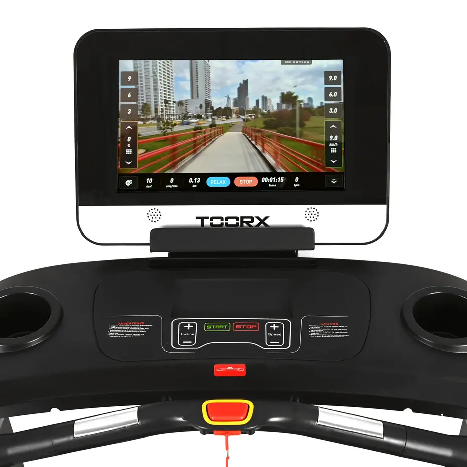 De 15,6” TFT HD touch screen console biedt een gebruiksvriendelijke interface met vooraf geïnstalleerde apps zoals Chrome, Facebook, Twitter, Instagram, Youtube, Netflix*, Spotify* en Prime Video*. (*Abonnement niet inbegrepen.) Hierdoor kunt u tijdens uw training genieten van uw favoriete entertainment. De console bevat ook een ingebouwde draadloze polsontvanger en wordt geleverd met een TOORX borstband voor nauwkeurige hartslagmeting. Bovendien is er een smartphone/tablethouder en een audio-ingang voor een MP3-speler, zodat u altijd verbonden blijft.