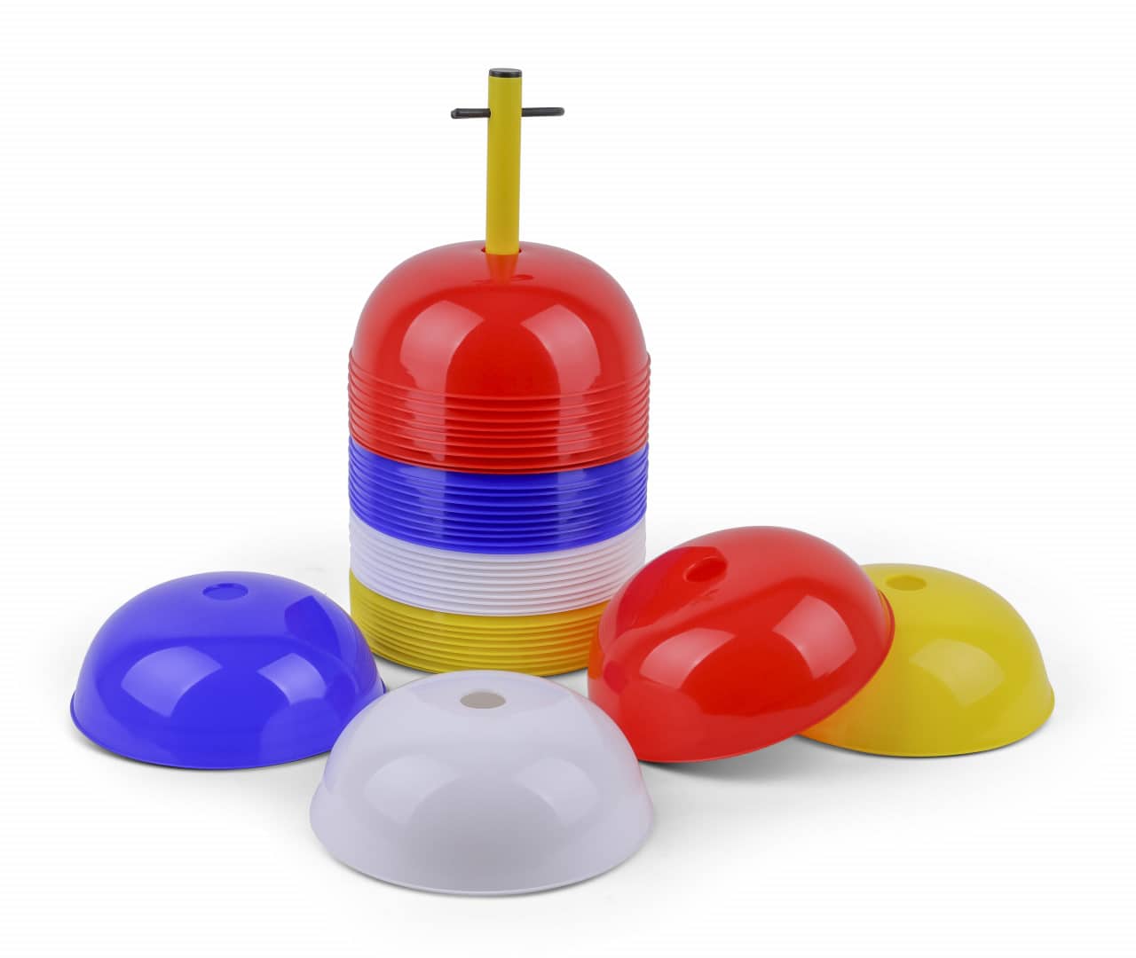 De halfronde markeringsbollen zijn van flexibel speciaal zacht PVC gemaakt. Hier kan de sporter vol op staan en geeft de bol makkelijk mee, zonder dat de sporter door zijn enkel gaat. De set word in 40 markeringsbollen geleverd met een staander.