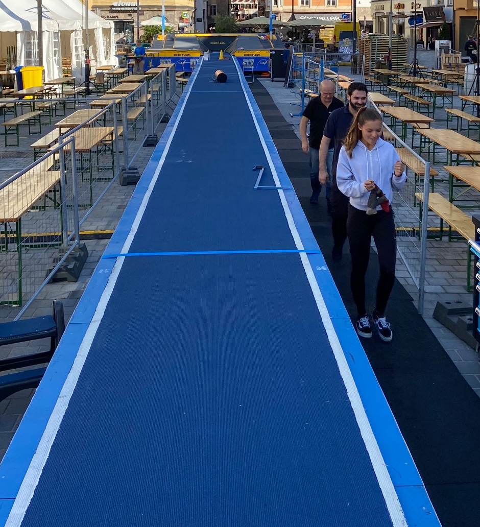 De mobiele aanloop kan zowel voor polsstokhoogspringen als voor verspringen gebruikt worden voor bijvoorbeeld opbouw/afbouw tijdelijke evenementen. Elk deel heeft een afmeting van 250cm lengte en is 122cm breed (ook bredere aanlopen zijn mogelijk). De polsstok insteekbak en/of de verspring afzetbalk worden volledig in de aanloop geintegegreerd. Zowel de polsstokhoog insteekbak als de afzetbalk verspringen zijn voorzien van een officiëel WA-certificaat en voldoen dus aan alle normeringen. De aanloop delen bestaan uit gegalvaniseerd stalen frames en worden afgewerkt met geïmpregneerde houten 24mm dikke underlayment platen. Daar bovenop komt een rubberen Mondo aanloopbaan; de totale hoogte van de aanloopbaan, inclusief Mondo rubber, bedraagt 25 cm.