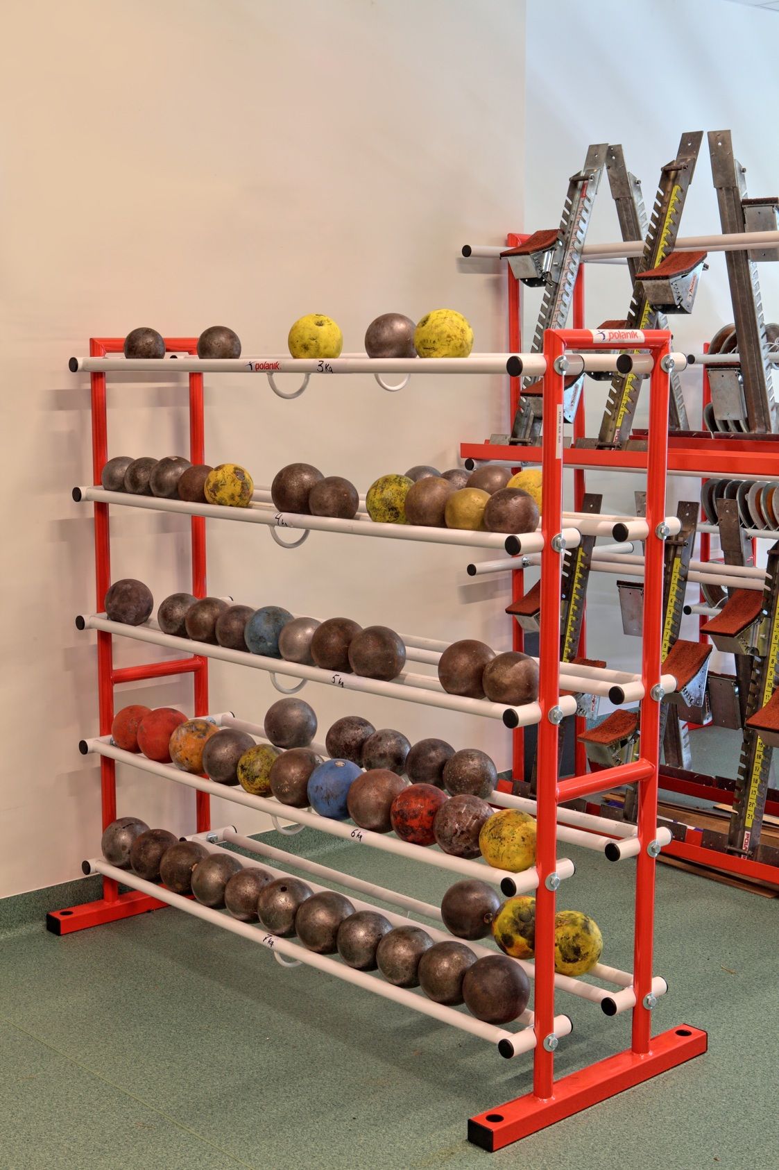 Polanik opbergrack voor kogels is gemaakt van stalen buizen en profielen met poedercoating, ontworpen voor opslag voor discussen of kogels in de opbergruimte, capaciteit 120 kogelstoten.