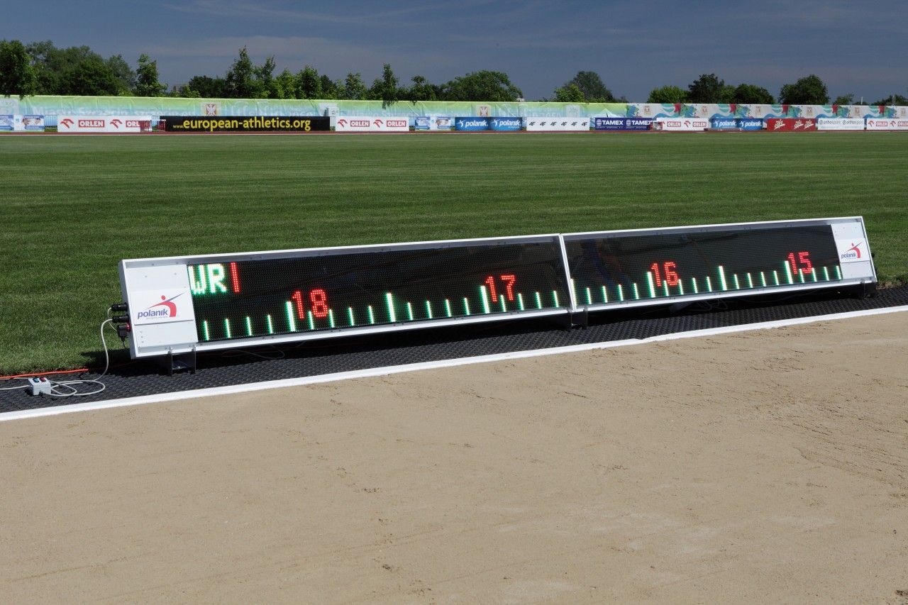 Polanik LED afstandmarkeringsbord ver-hinkstapspringen is ontworpen om de afstand van de sprong van de atleet bij ver of hink-stapspringen te illustreren, de behuizing is gemaakt van aluminium, gepoedercoat, voor buitengebruik, werktemperatuurbereik: van -10 ° C tot + 50 ° C, extra uitrusting: bedraad bedieningspaneel. Er kunnen op voorhand record (NR, ER, WR en of Qualificatie afstanden) aangeduid worden op de display.
