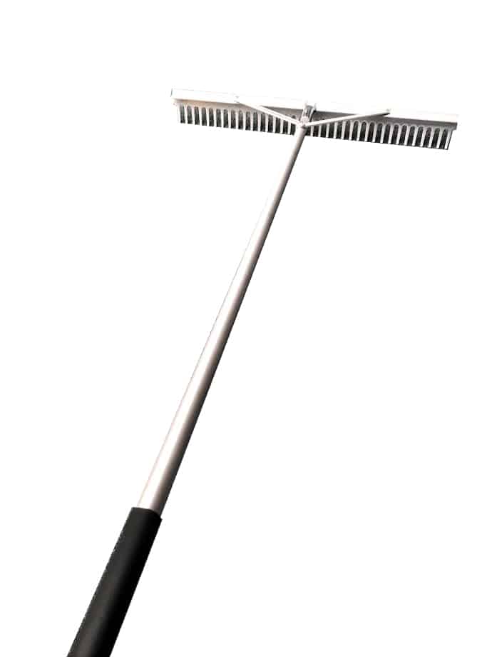 De hark is gemaakt van aluminium en is 92 cm breed.