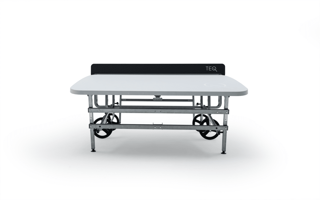 De Teqball – Teq LITE is een mobiele ronde voetbaltafel en gemaakt van versterkte polyester glasvezel tafelblad. De teqball voetbaltafels (ronde tafel) worden veel gebruikt op sportaccommodaties en entertainment centra’s om het speelelement centraal te stellen. Maar met deze tafel wordt men uitgedaagd om de coördinatie, aanpassingsvermogen en behendigheid te trainen. De tafel is voor zowel binnen als voor buiten gebruik: is waterdicht en bestand tegen UV-stralen. Deze opvouwbare tafel is een ruimtebesparende oplossing en is uitgerust met een openend en sluitend systeem. De tafel heeft grote zwenkwielen om de besturing te vergemakkelijken. Het frame is gemaakt van stevige stalen poten.